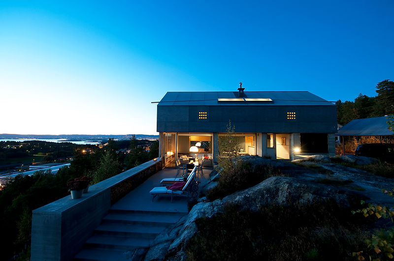 A beautiful but very complicated bedrock provides the ground for this small house. The ground floors are four concrete terraces adapting to the topography. The intimacy of the relation between house and rock are almost such that one feels sitting on the ground at the dining table. The bedrooms are floating above in a separated timber volume clad in black fiber cement boards.