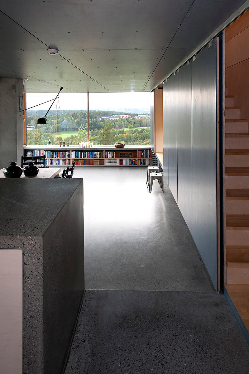 The house lies in a small valley with restricted sun during winter. The stairwell is designed to provide ample daylight for the ground floor also during those days with almost horizontal sunlight.
